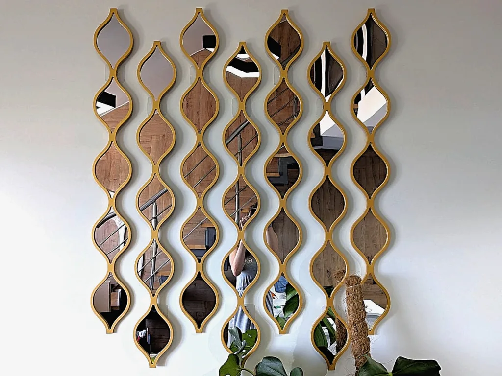 A gold blob mirror collage offers versitality and can compliment various interior design styles. Whether it’s a modern, vintage, or a contemporary living space, a well-chosen gold mirror can blend seamlessly with the existing decor. It can serve as a versatile piece that ties together different elements in the room and adds a touch of timeless elegance.