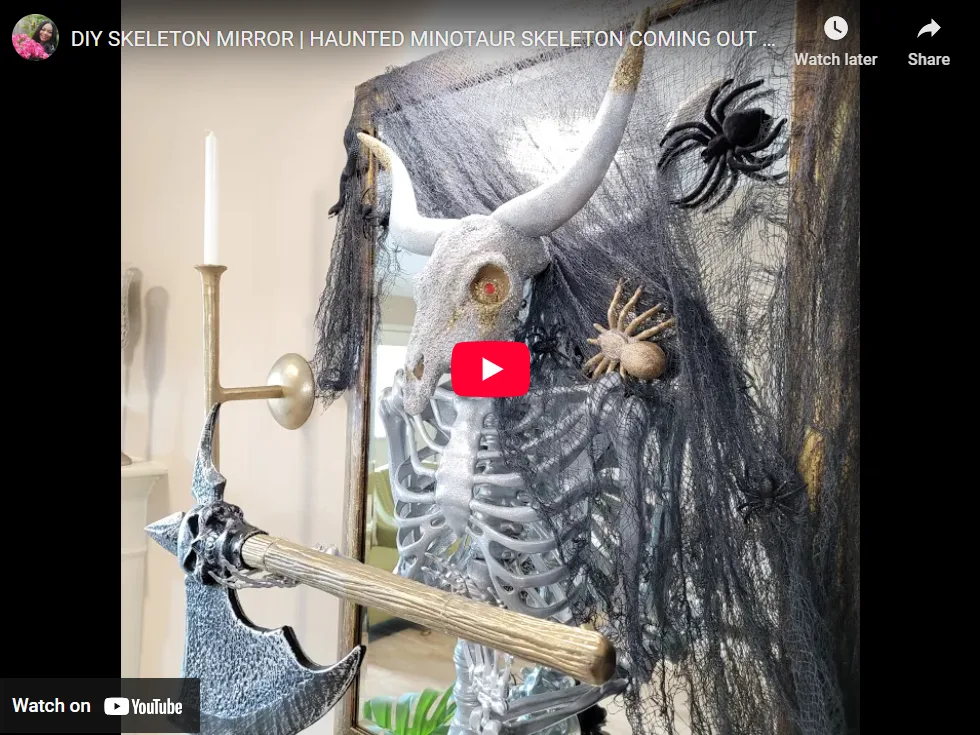 Check out the skeleton mirror video tutorial below and all supplies used are listed so you can create your own Minotaur Skeleton Mirror too.