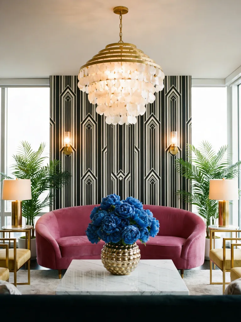Furniture & decor: Geometric mirrors, velvet sofas, gold accents, and marble tables are classic elements that instantly evoke that glamorous Art Deco look.